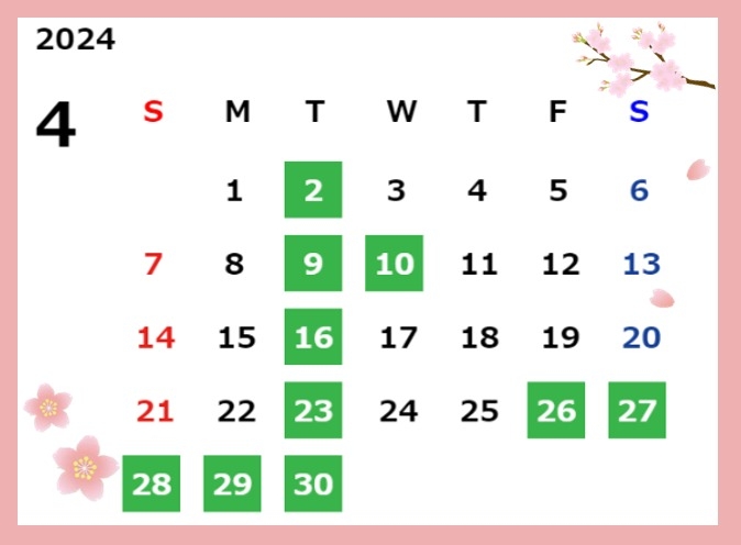 本日は4月の定休日のお知らせです🌸