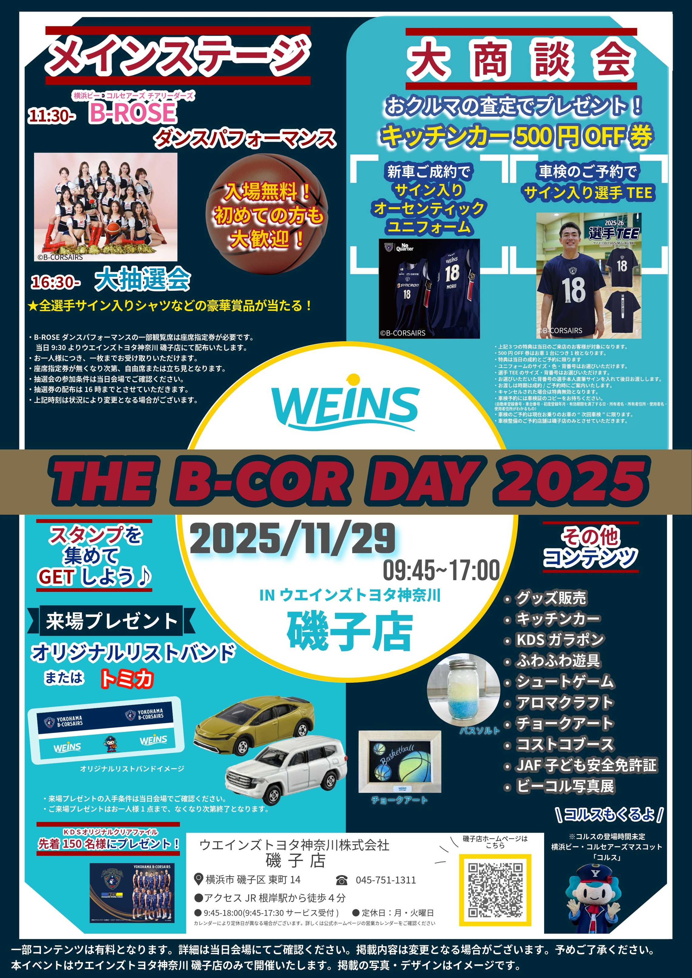 今年も地域の皆さまと一緒に楽しめるウエインズトヨタ神奈川 磯子店🚘×横浜ビー・コルセアーズ🏀🏴のコラボイベント「THE B-COR DAY 2025」を開催します!