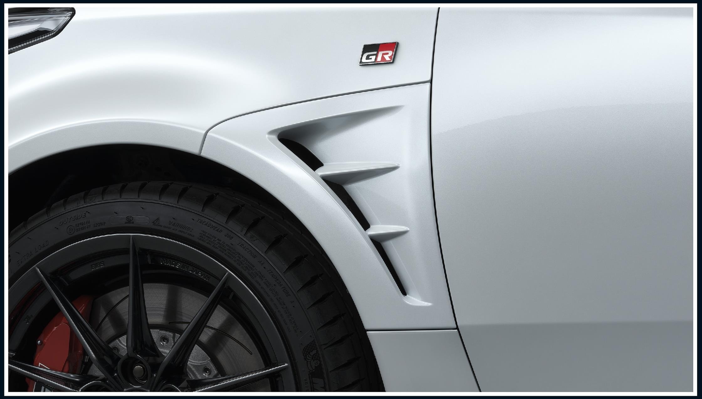 ホイールハウス内に溜まる空気を後方へ放出させます。ノーズダイブ(急減速時にフロントが沈み込む現象)時のステアリングフィールや、コーナー入り口での操縦安定性を向上させます。こちらのアイテムもスーパー耐久シリーズにて、GRヤリス 開発主査である齋藤 尚彦さん、モリゾウマスタードライバーお二人のもと、何度も形状を変更検討され、開発されました。