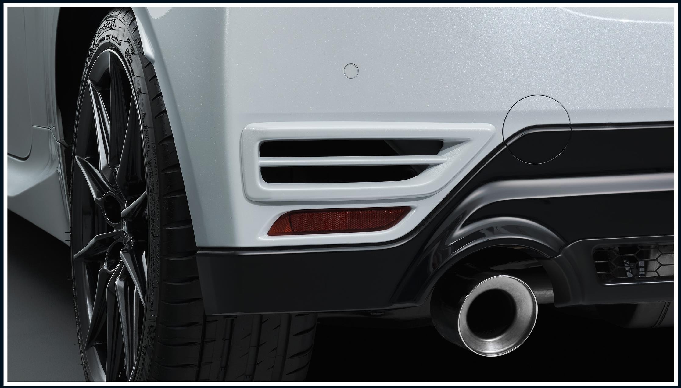 リアバンパー内に溜まる空気を後方へ放出させます。パラシュート効果(車両前方からの走行風をリアバンパーが受け止めて空気が滞留し、余分な空気抵抗が発生する現象)の抑制により、リアバンパーまわりのCd値を低減しました。こちらもスーパー耐久シリーズにGRヤリスが参戦した際に、その後ろを走る大嶋選手から、「バンパー下面がすごいバタついている」という指摘をもらい、開発、実装されました。