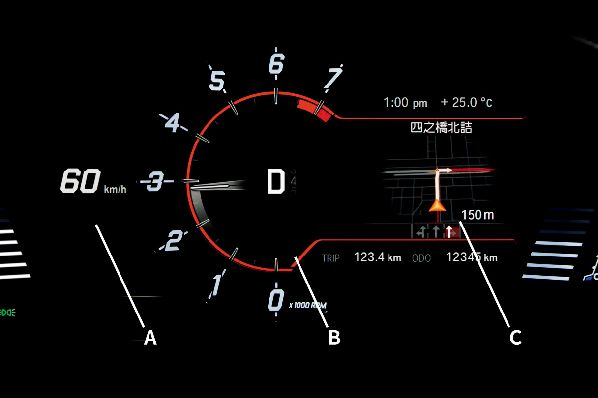 B:アナログ表現のタコメーター、セレクターレバーポジション/シフトタイミングインジケーターなど